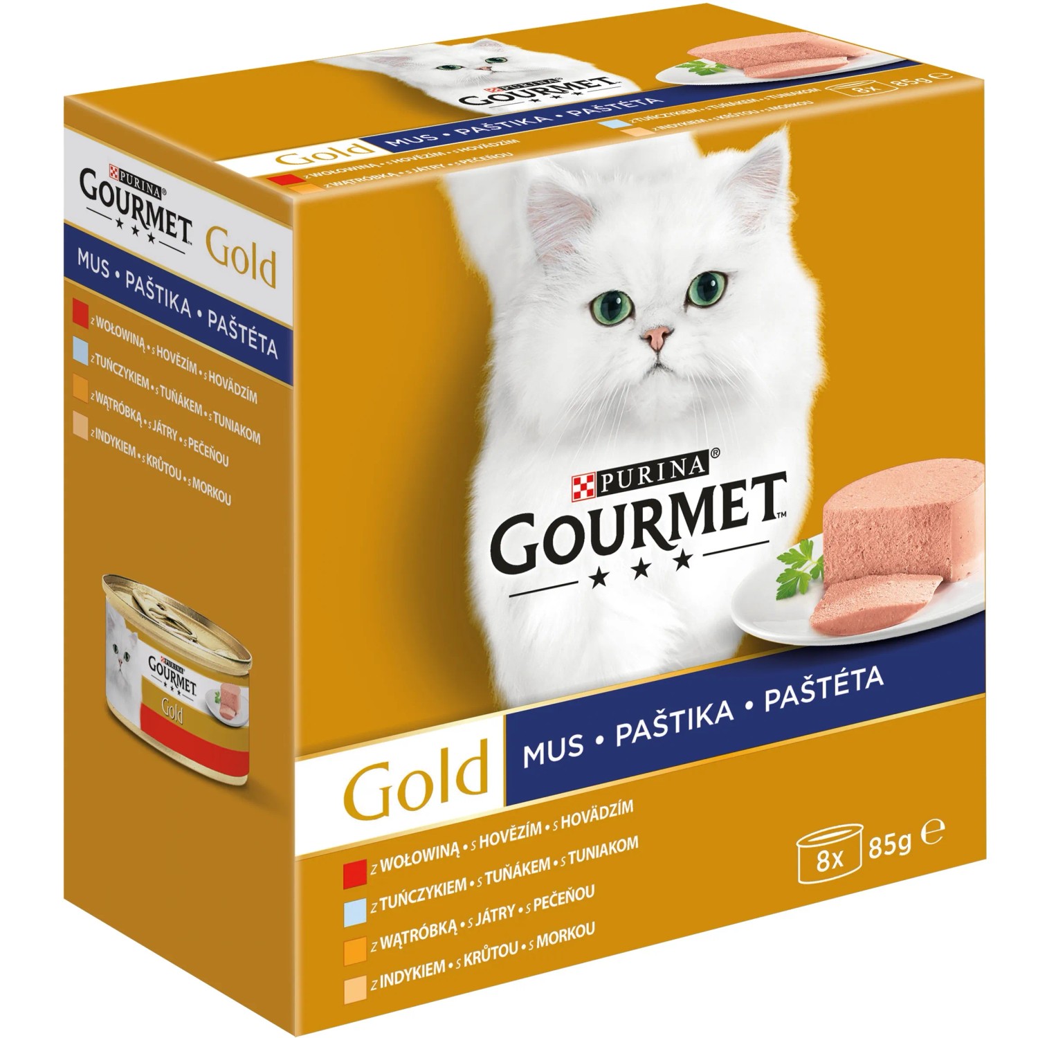 Kompletné krmivo pre dospelé mačky Gourmet Gold. Gourmet Gold vytvoril paštéty lahodnej receptúry, ktoré budú rozmaznávať jej maškrtný jazýček novým chuťovým zážitkom. Jemné paštéty s hovädzím, kuraťom, lososom a ďalšími vynikajúcimi príchuťami, starostlivo pripravené tak, aby ponúkli vašej mačke pôžitok z delikátnej a jemnej textúry. Gourmet Gold paštéty zvádzajú vašu mačku jemnou zamatovou chuťou! Zloženie: S tuniakom: mäso a vedľajšie produkty živočíšneho pôvodu, ryby a vedľajšie produkty z rýb (z toho 4 % tuniaka), minerálne látky, vedľajšie produkty rastlinného pôvodu, cukry. S pečeňou: mäso a vedľajšie produkty živočíšneho pôvodu (z toho 4 % pečene), minerálne látky, vedľajšie produkty rastlinného pôvodu, cukry. S morkou: mäso a vedľajšie produkty živočíšneho pôvodu (z toho 4 % morky), minerálne látky, vedľajšie produkty rastlinného pôvodu, cukry. S hovädzím: mäso a vedľajšie produkty živočíšneho pôvodu (z toho 4 % hovädzieho), minerálne látky, vedľajšie produkty rastlinného pôvodu, cukry.