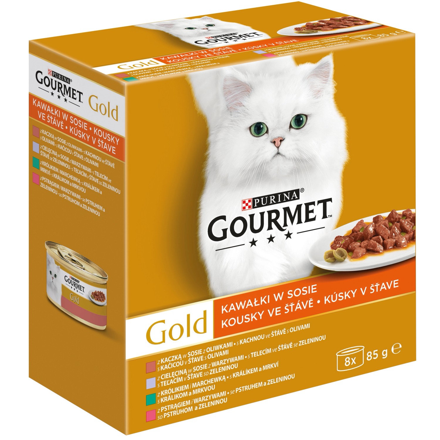 Kompletné krmivo pre dospelé mačky Purina Gourmet Gold. Gourmet Gold vytvoril kúsky v šťave so zeleninou, lahodné receptúry, ktoré budú každý deň rozmaznávať jej maškrtný jazýček novým chuťovým zážitkom. Jemné kúsky s teľacím, pstruhom a ďalšími vynikajúcimi príchuťami, povarené k dokonalosti a obklopené lahodnou šťavou a jemnou zeleninou, ponúka vašej mačke potešenie z výbornej a plnej chuti. Gourmet Gold kúsky v šťave so zeleninou zvádzajú vašu mačku šťavnatou chuťou! Zloženie: So pstruhom a zeleninou: mäso a vedľajšie produkty živočíšneho pôvodu, obilniny, ryby a vedľajšie produkty z rýb (z toho 4 % pstruha ), minerálne látky, zelenina (0,45 % dehydrovanej zeleniny, zodpovedajúce 4 % zeleniny), cukry. S králikom a mrkvou: mäso a vedľajšie produkty živočíšneho pôvodu (z toho 4 % králika), obilniny, minerálne látky, zelenina (0,45 % dehydrovanej mrkvy, zodpovedajúce 4 % mrkvy), cukry. S teľacím v šťave so zeleninou: mäso a vedľajšie produkty živočíšneho pôvodu (z toho 4 % teľacieho), obilniny, minerálne látky , zelenina (0,45 % dehydrovanej zeleniny, zodpovedajúce 4 % zeleniny v šťave), cukry.