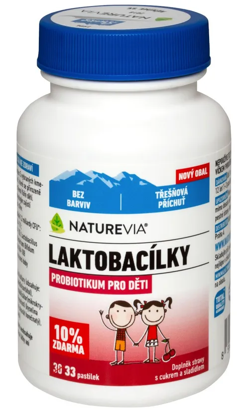 NATUREVIA Laktobacilky Kids čerešňové 33 pastiliek Výživový doplnok, čerešňové pastilky. Každá pastilka obsahuje 5 humánnych kmeňov baktérií (1,2 miliardy aktívnych buniek na konci expirácie) chrá...