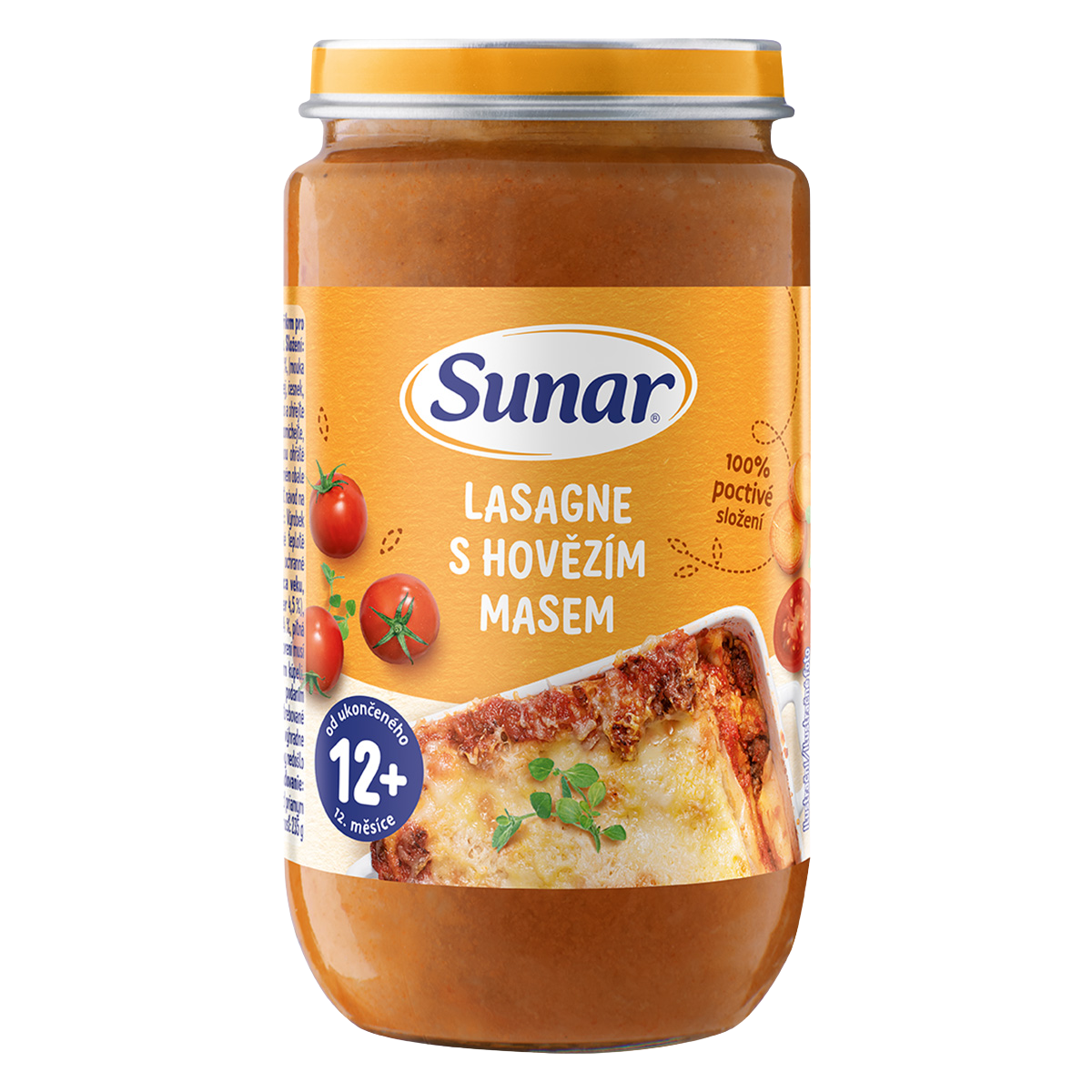 SUNAR Príkrm lasagne s hovädzím mäsom 12m+, 235 g Zeleninovo-masový príkrm pre malé deti od ukončeného 12. mesiaca veku. S mäkkými kúskami potravy pre správny vývoj žuvania a hryzenia.